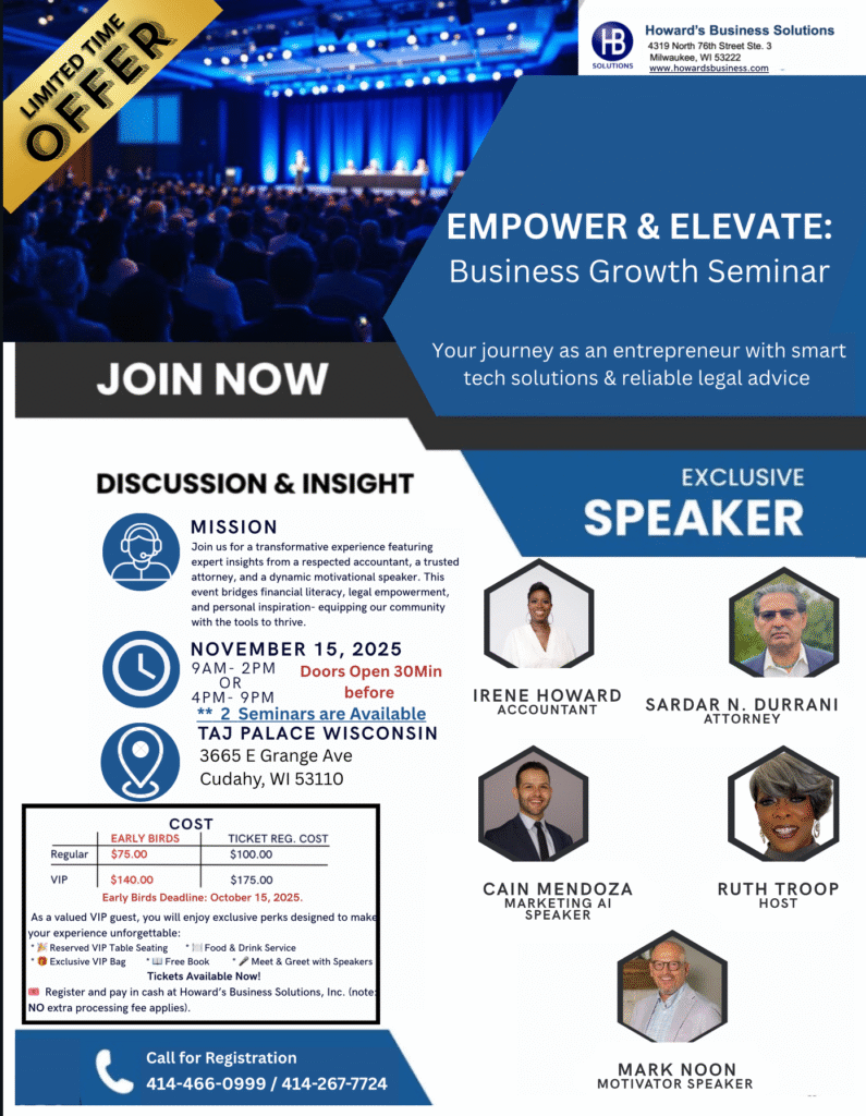 Considering starting a new business or already running a successful one? This seminar will deepen your understanding and knowledge. Join us! For more information or to purchase tickets in person, Contact Irene at 414-340-9395 or visit us at 4319 N 76 ST STE 3, Milwaukee, WI 53222.